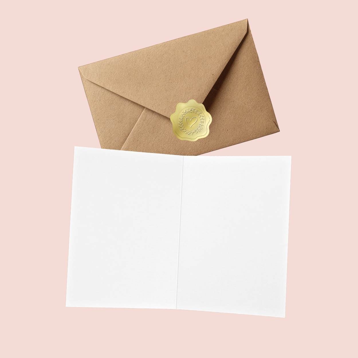 Incluye un sobre de papel Kraft marrón y un sticker de corazón dorado para sellar el sobre.